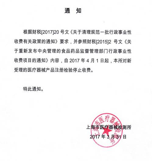 關(guān)于2017年4月1日起新受理的醫(yī)療器械產(chǎn)品注冊檢驗(yàn)停止收費(fèi)的通知