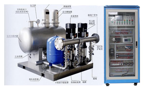 無負壓供水實訓裝置由鋼結構底座、無負壓罐、控制單元、顯示單元、泵閥等組成。