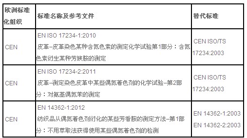 | CEN | EN ISO 17234-1:2010 皮革–皮革染色某種含氮色素的測(cè)定化學(xué)試驗(yàn)第1部分:含氮色素衍生某種芳族胺的測(cè)定 |